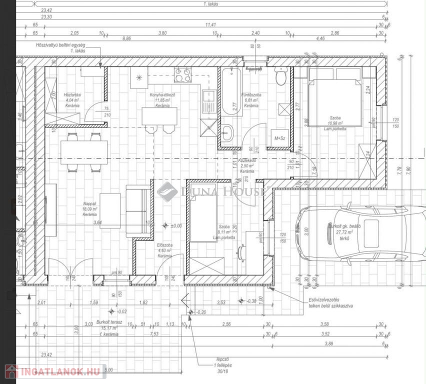 Kialakítása: 2 szoba, tágas amerikai nappali konyha, háztartási helyiség, előtér, közlekedő, fürdő+wc, nyitott terasz.