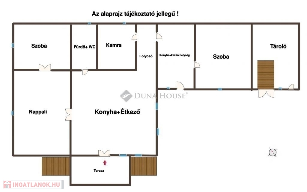 Az ingatlan lakott, felújított és fűtött része kb. 100 m², ahol kényelmes elrendezésben található egy hálószoba, nappali, konyha-étkező, fürdőszoba WC-vel, valamint egy kamra, amely mosókonyhaként is funkcionál.