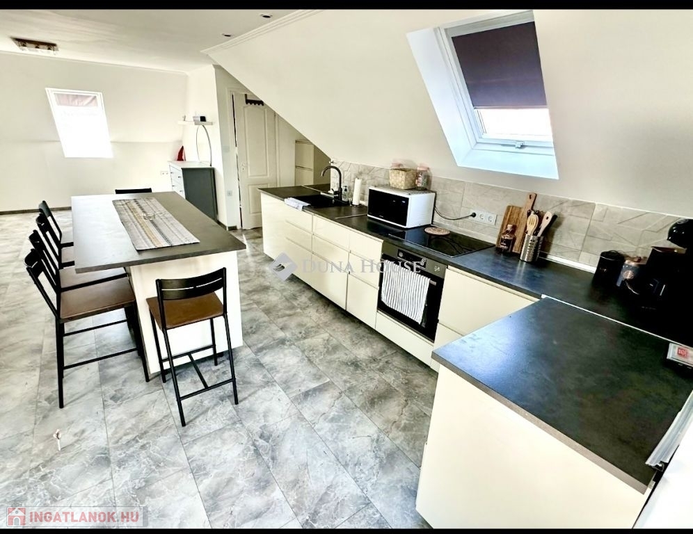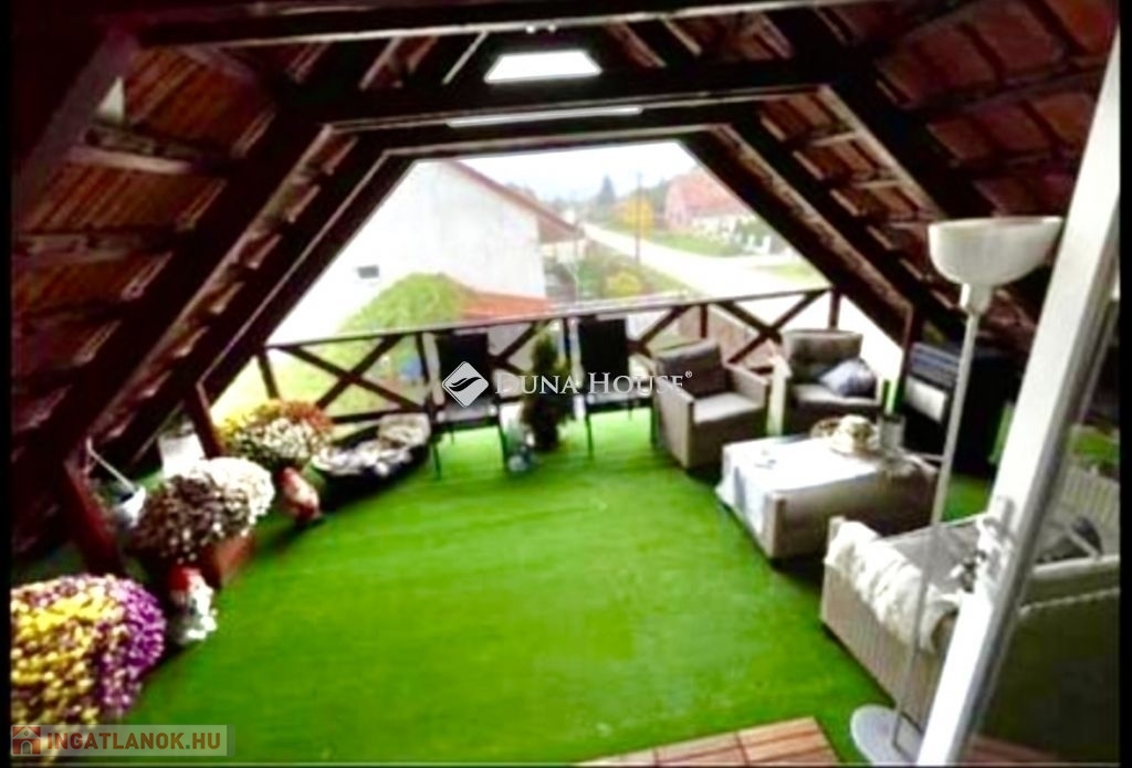 A ház mellett került megépítésre egy külső lépcső, mely felvezet minket az emeletre. Itt is található egy az udvarra néző 20nm tetőtéri terasz. A bejárati ajtaja és ablakai az emeleti lakásnak szintén műanyagok már. Belépve az ajtón egy tágas, napfényes amerikai konyhás nappalis kialakítás kapott arcot 2024-ben. A nappaliból nyílik egy hálószoba és egy zuhanyzós fürdőszoba. A nappali nagyságából adódóan szükség szerint még egy kis szoba kialakítható akár. Emeleti belmagasság 2,36m.