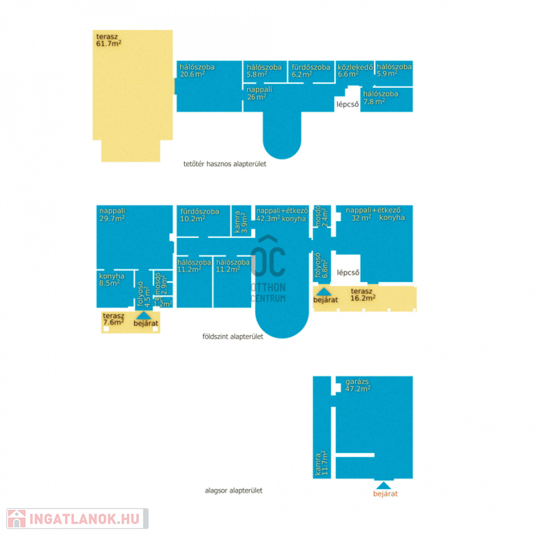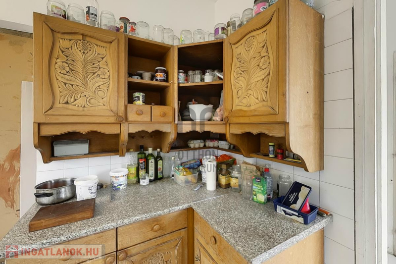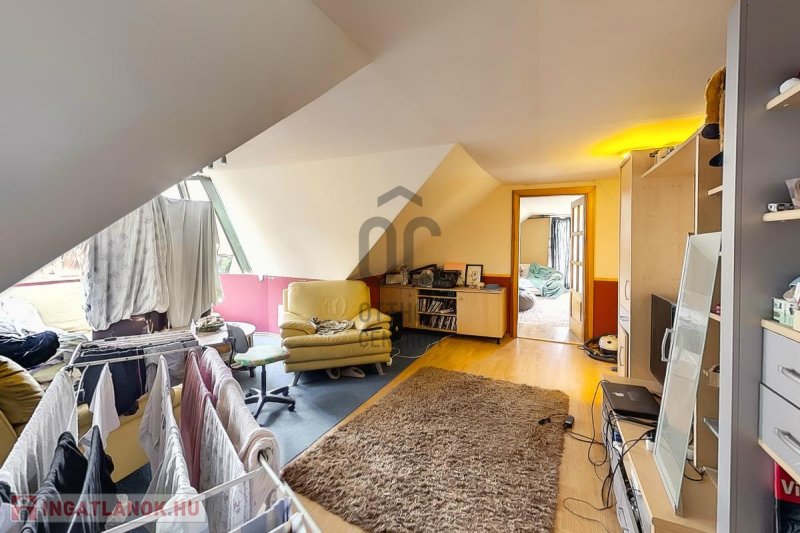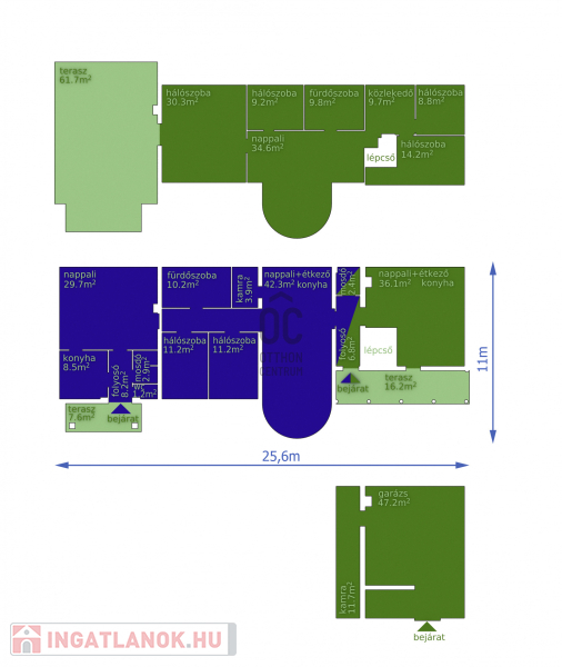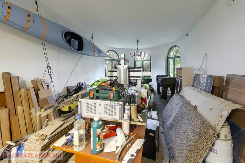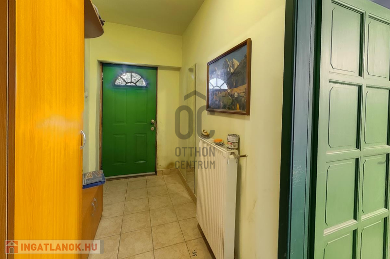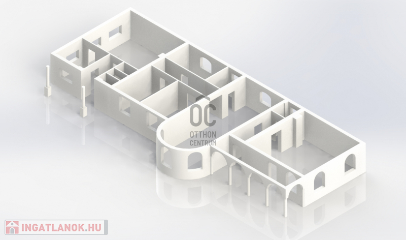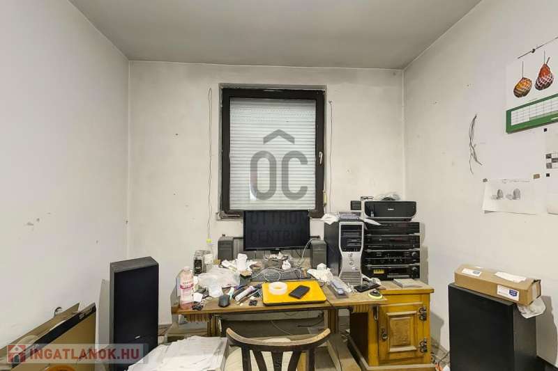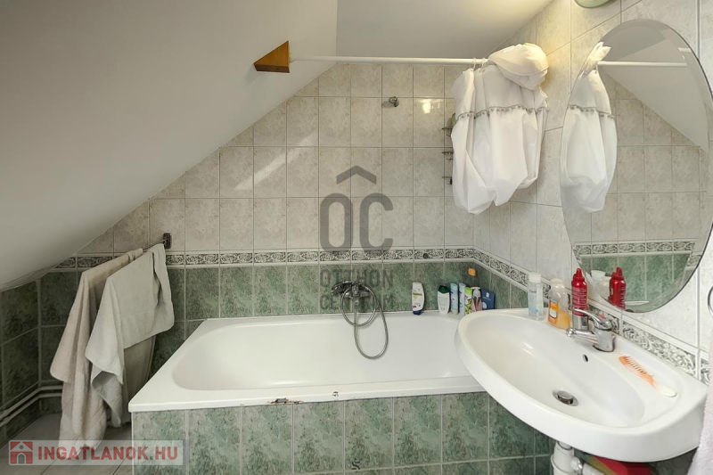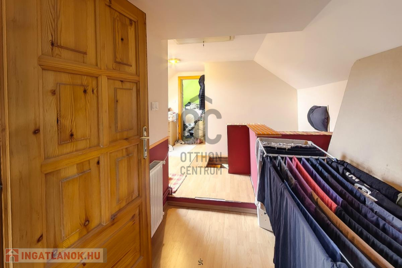 Ház: 2 bejárat így külön is válaszhatóan , 2 szintes , tégla , klasszikus 2 generációs ház , 3 nappalival + 5 hálószobával , 2 fürdővel , nagy műhellyel és garázzsal , tetőterasszal befejezésre váróan .