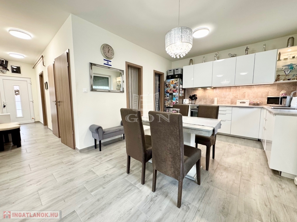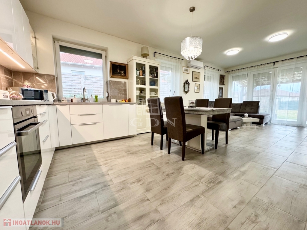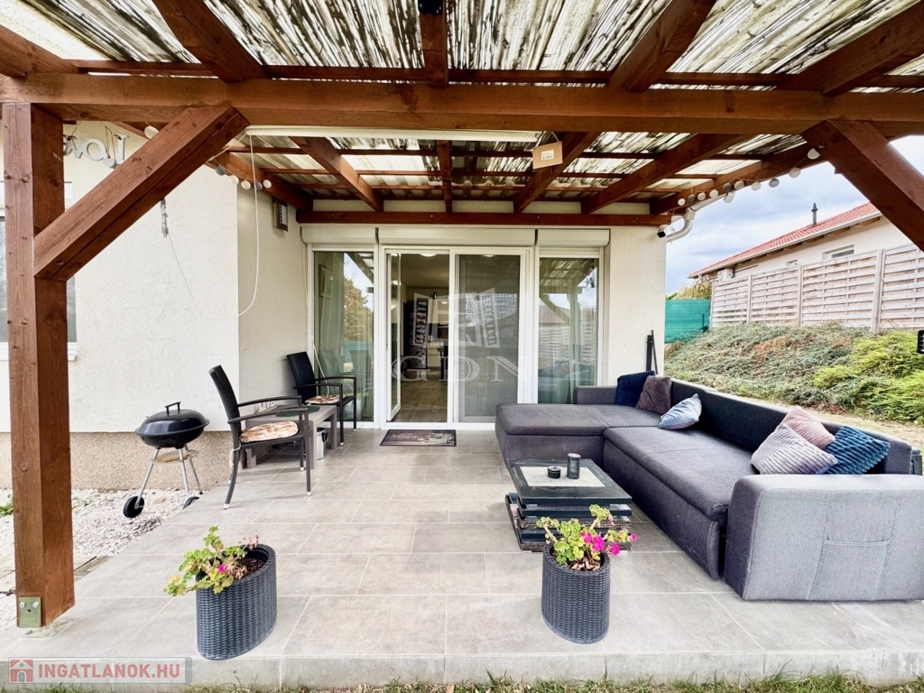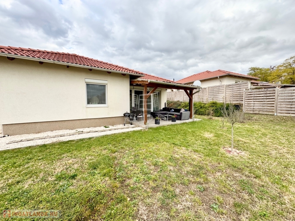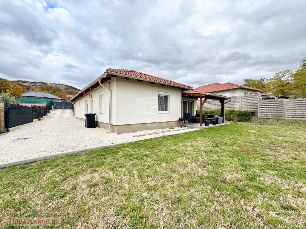 Budapest és Esztergom között a pilisi hegyek ölelésében található hangulatos településen, Pilisjászfalun újonnan, a Somlyó völgyi lakóparkban, csendes jelenleg még murvával borított összközműves mellékutcában, 800 nm-es saját kerttel rendelkező, 2020-ban épült, szigetelt, egyszintes, 71 nm-es lakóterületű, nappali + 3 háló szobás, amerikai konyhás, kamrás, közvetlen kert-teraszkapcsolatos, kiváló elosztású, külön nyíló szobás, napos-világos D-NY-i fekvésű, alacsony fenntartású, modern, kondenzációs gázkazán fűtésű, újszerű állapotú, klimatizált, riasztórendszerrel felszerelt ikerház fél, beépített, gépesített konyhával, 2 gépkocsi számára alkalmas felszíni gépkocsi beállóval, 8 nm-es kerti tárolóval, gondozott kerttel, eladó.