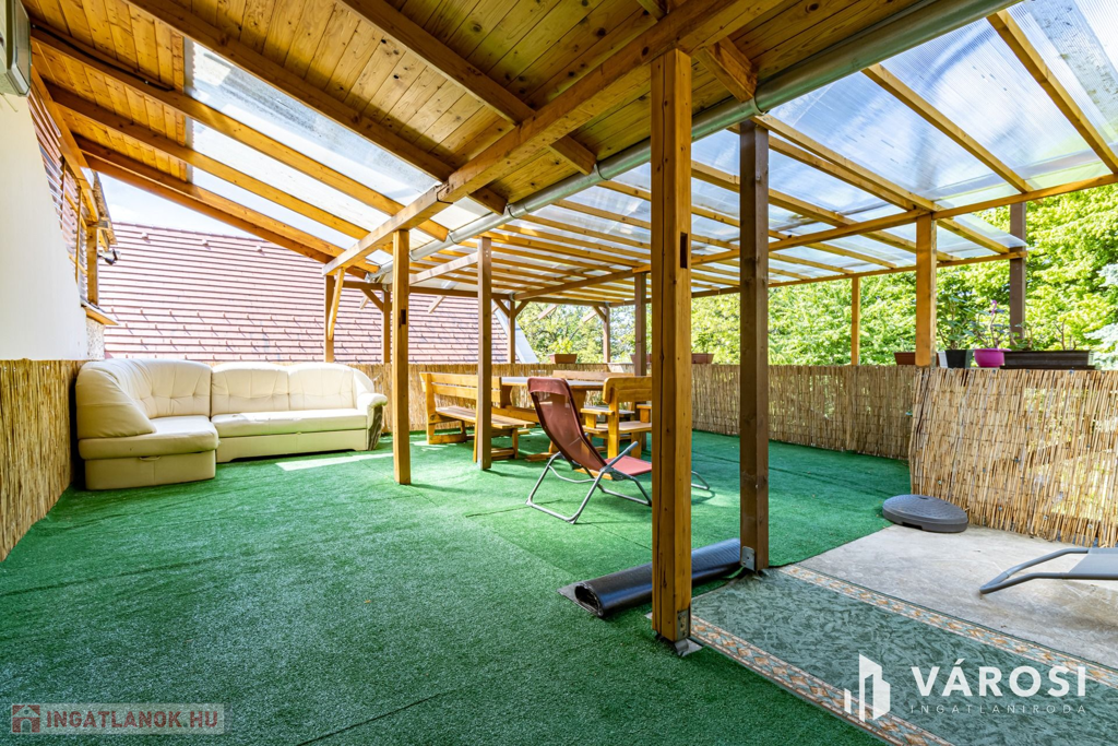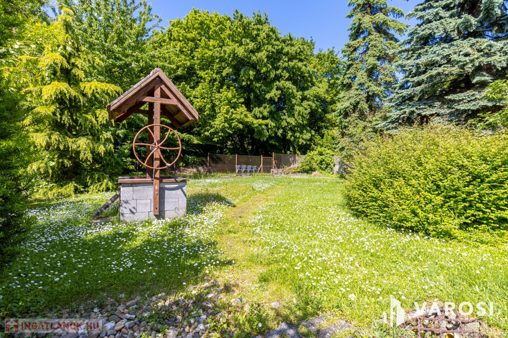 A ház egy 957 m²-es telken helyezkedik el, amely ideális méretű: könnyen karbantartható, mégis élhető kert. A telek hátsó részén egy kis patak csörgedezik.