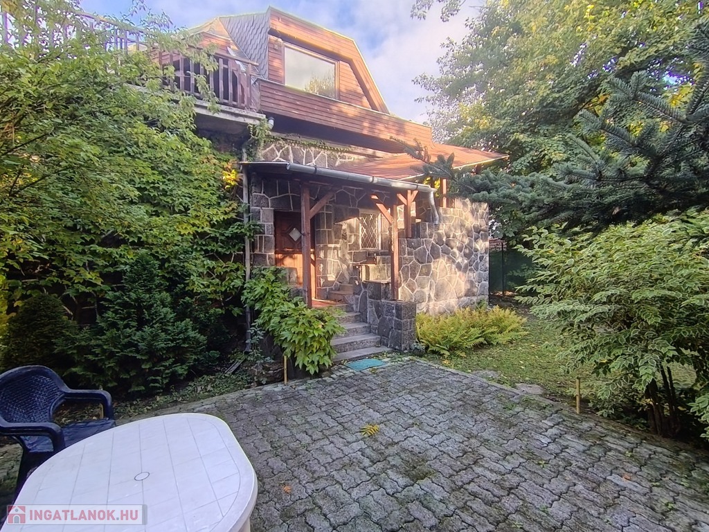 Dobogókő csendes kis mellékutcájában, az Arany János utcában, árnyas fák között húzódik a kétszintes, kívülről terméskő burkolattal védett családi ház, a tulajdoni lapon „hétvégi ház” megjelöléssel.