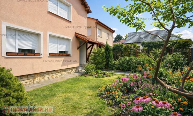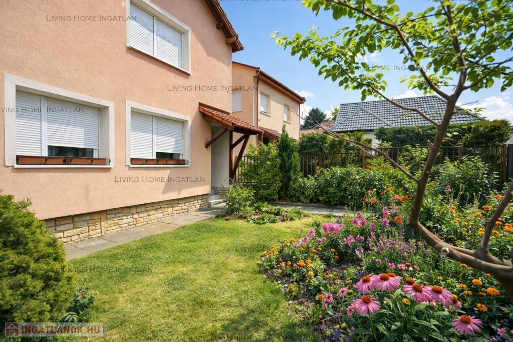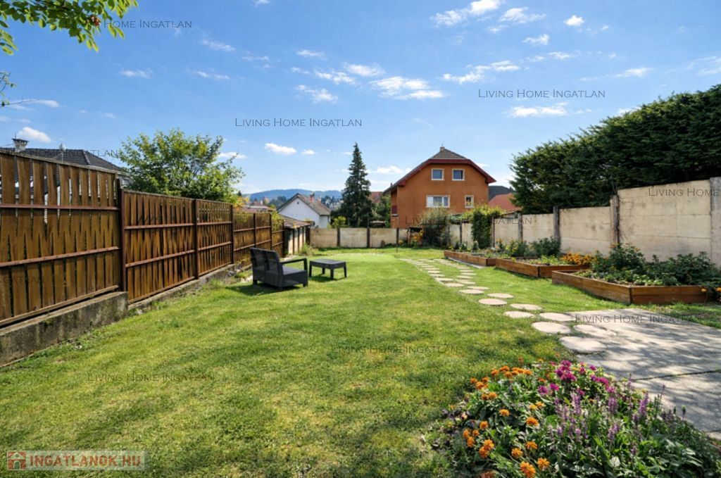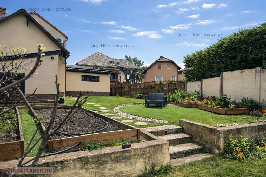 A teljes kertben öntözőrendszer, magaságyások, gyümölcsfák (cseresznye, alma, füge, áfonya, szeder). A hátsó részen intim pihenőkert grillezővel, kerti medencének kialakított terület.