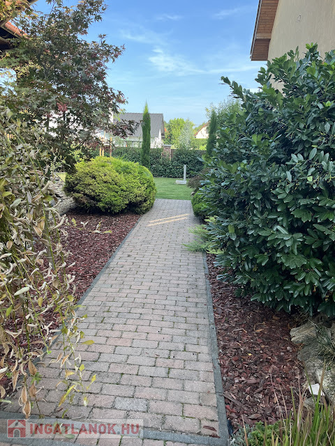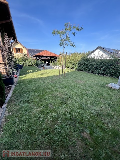 A telek hátsó részére 14m2 hasznos területű, fából készült szaletli lett építve. A kert parkosított, automata öntözőrendszerrel van telepítve.