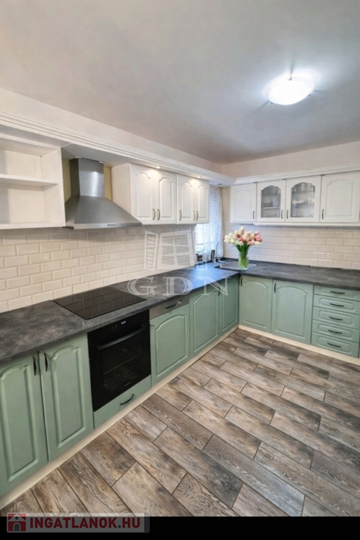 Felszereltsége: Indukciós főzőlap, pára- és szagelszívó, beépített mikrohullámú sütő, beépített elektromos sütő, illetve mosogatógép kapott helyet.
