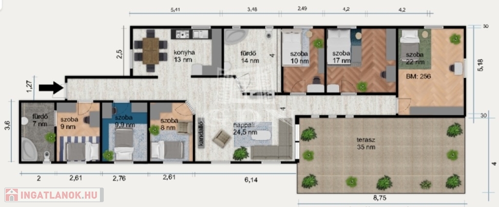 Terasz: 35 m² (nem fedett)