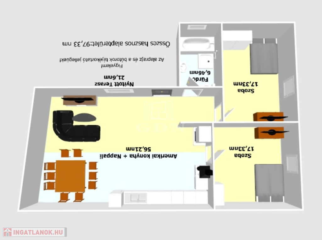 - amerikai stílusú konyha + nappali,