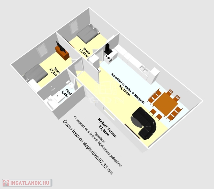 - amerikai stílusú konyha + nappali,