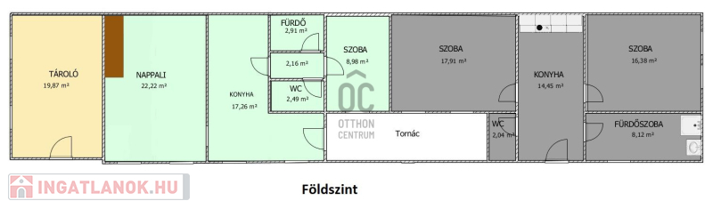 A ház 410nm-es 3 gépkocsi parkolóhellyel ellátott telken helyezik el. A két lakrész teljesen elkülönül egymástól, a kisebb házrészben (mely közelebb helyezkedik el az utca fronthoz) nappali, hálószoba, konyha, fürdőszoba, külön toalett került kialakításra. A nagyobb házban a földszinten, konyha, nappali, fürdőszoba, toalett, 1 hálószoba, az emeleti szinten 3 hálószoba, fürdőszoba került kialakításra.