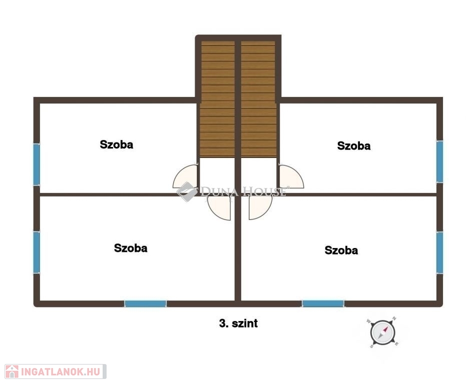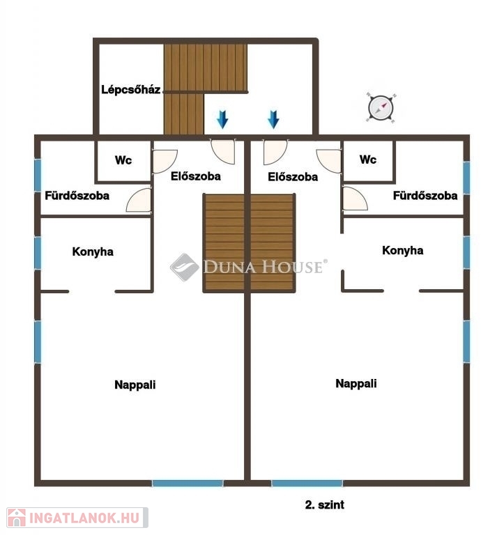 A felső két szinten egy-egy duplex kialakítású, nappali + 2 hálószobás lakás helyezkedik el, melyek egy zárt lépcsőházból érhetőek el, az épület többi részének érintése nélkül (minden lakrész és az alsó szint is külön bejárattal rendelkezik).