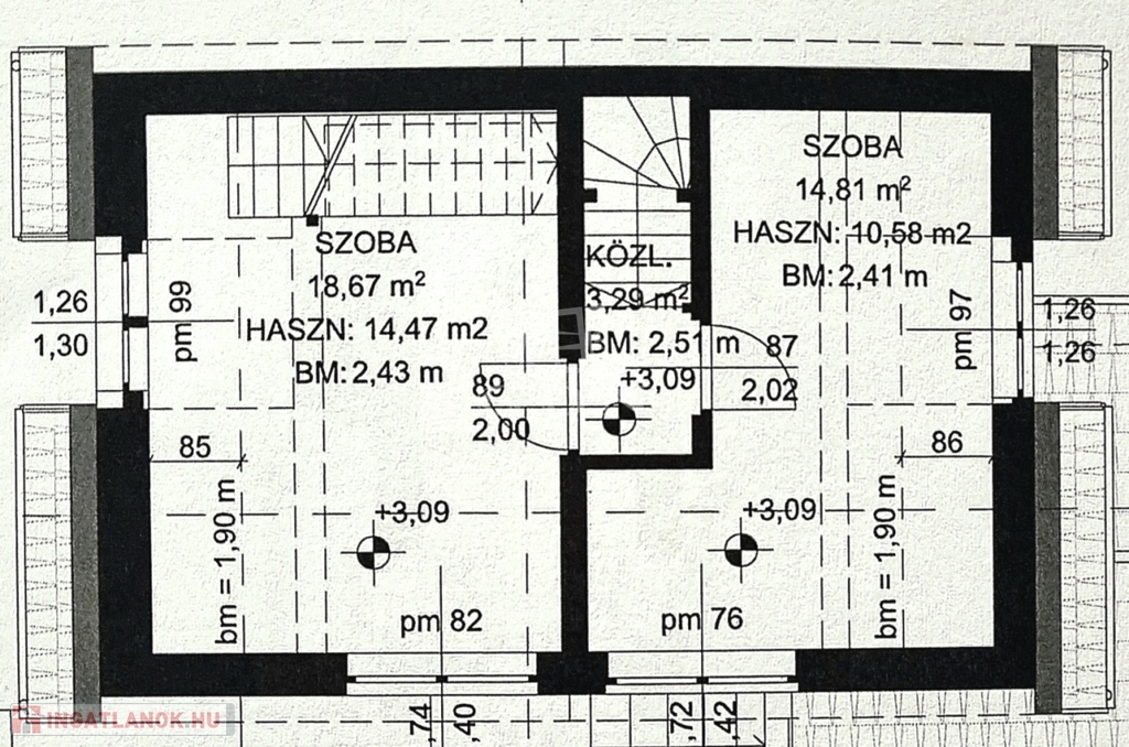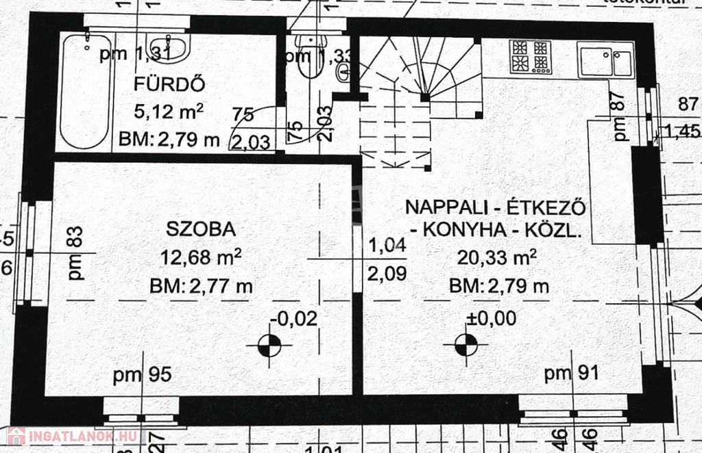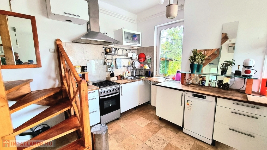 Az alsó szinten 1 szoba, tároló, a földszinten amerikai konyhás nappali, háló, fürdő, wc lett kialakítva.