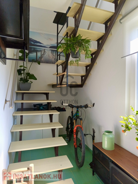 Az alsó szint belmagassága 2,75 m, a két szint közötti lépcsőház zárható ajtóval elválasztott, tehát a két szint egymástól függetlenül, önállóan használható.