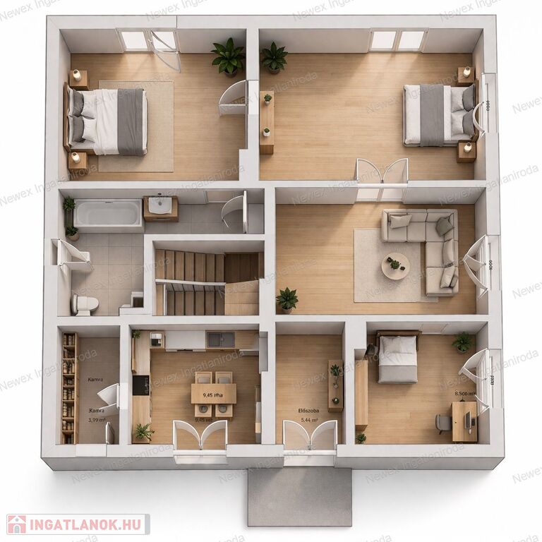 A ház 2 szoba + 1 félszoba elrendezésű, amely praktikus alapot biztosít egy kisebb család számára, ugyanakkor a belső terek jól alakíthatók, igény szerint modernizálhatók. A keleti tájolásnak köszönhetően a helyiségek világosak, barátságosak, a reggeli napfény kellemes hangulatot teremt.