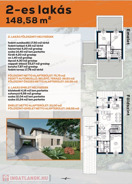 A földszint és az emelet nettó alapterülete így 148,58 nm.