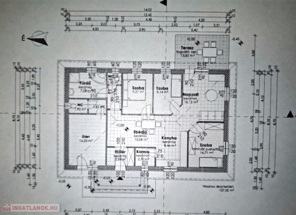 Az Otthon helyiségei:előtér 3,84 m2, ebédlő 15,04 m2, konyha 8,46 m2, nappali 16,13 m2, szoba 14,71 m2, szoba 8,14 m2, szoba 9,21 m2, fürdőszoba 7,08 m2, wc 1,20 m2, jelenleg üzlet/szoba 14,33 m2,