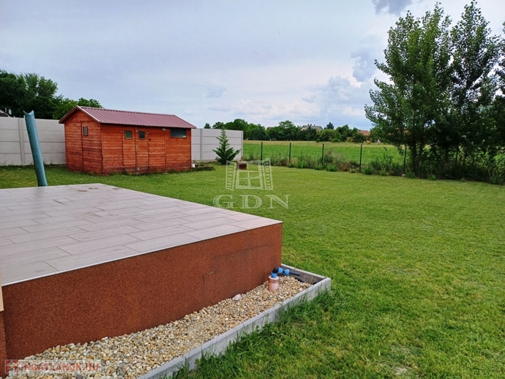 A kert rendezett, öntözése fúrt kútról biztosított, a kerti szerszámok tárolására 12 m2 kerti tároló épült.