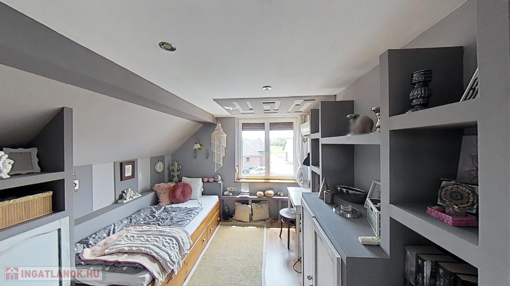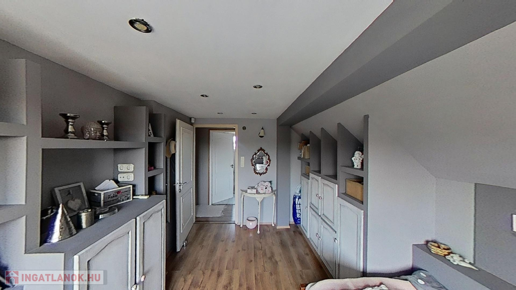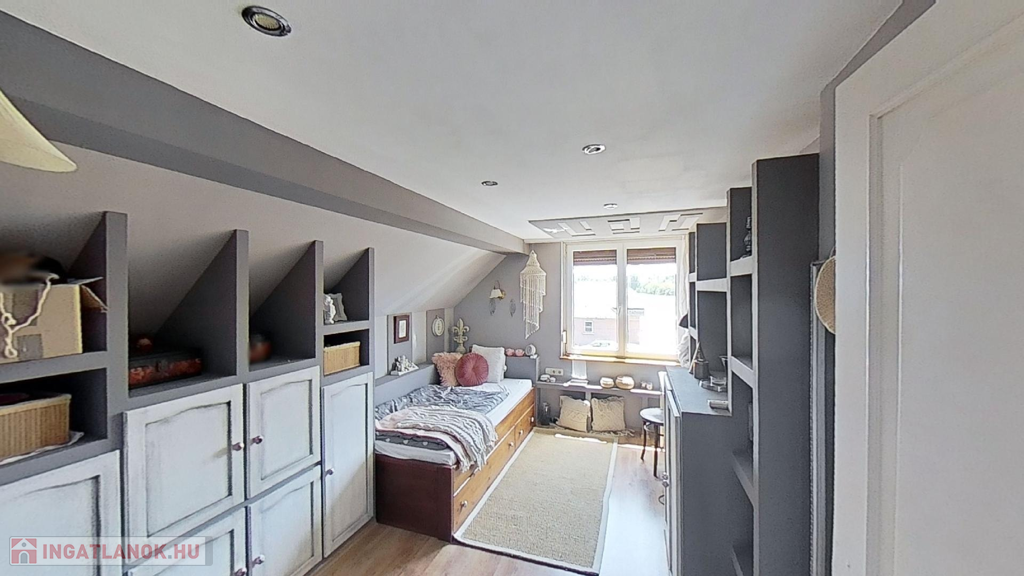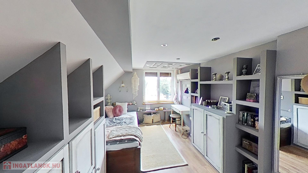 Az emeleten további 2 teljes értékű és egy fél hálószoba, fürdőszoba/wc, valamint egy gardrób szoba került kialakításra, picit több, mint 40 hasznos négyzetméteren.