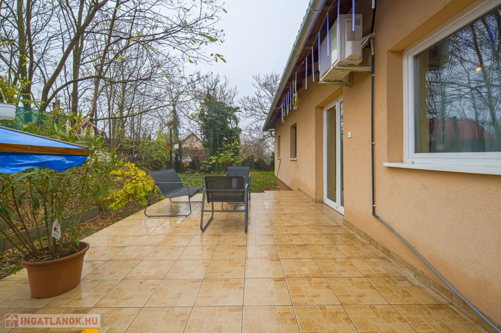 Az ingatlan a 22 m²-es garázson keresztül kapcsolódik a szomszédos épülethez. A nagyméretű teraszra a nappaliból lehet kilépni, és a telek elrendezésének köszönhetően az ingatlan szinte teljesen körbejárható.