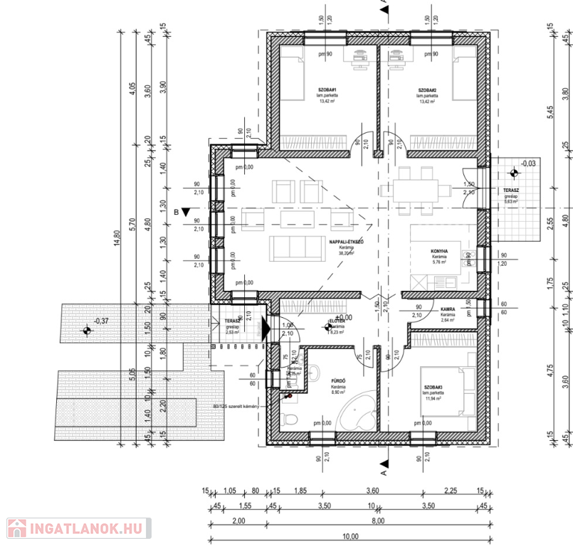 A 112 m²-es alapterületű, földszintes téglaépítésű ház ideális választás mindazoknak, akik korszerű, mégis természetközeli életteret keresnek.