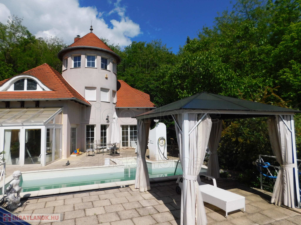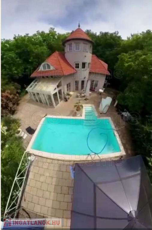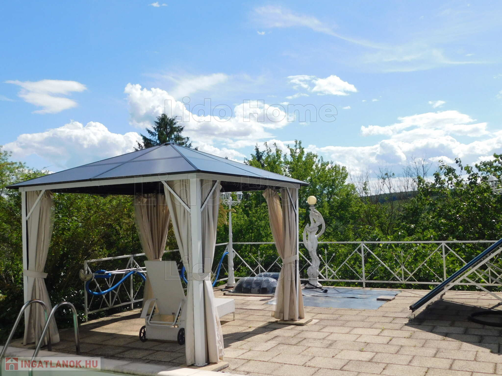 - földszint: előszoba, közlekedő, konyha+étkező, kamra, nappali, téli kert, kávézó bárpulttal, WC kézmosóval, panorámás grillező és napozó terasz medencével, amely: 5*8 m, 1,5 m mély