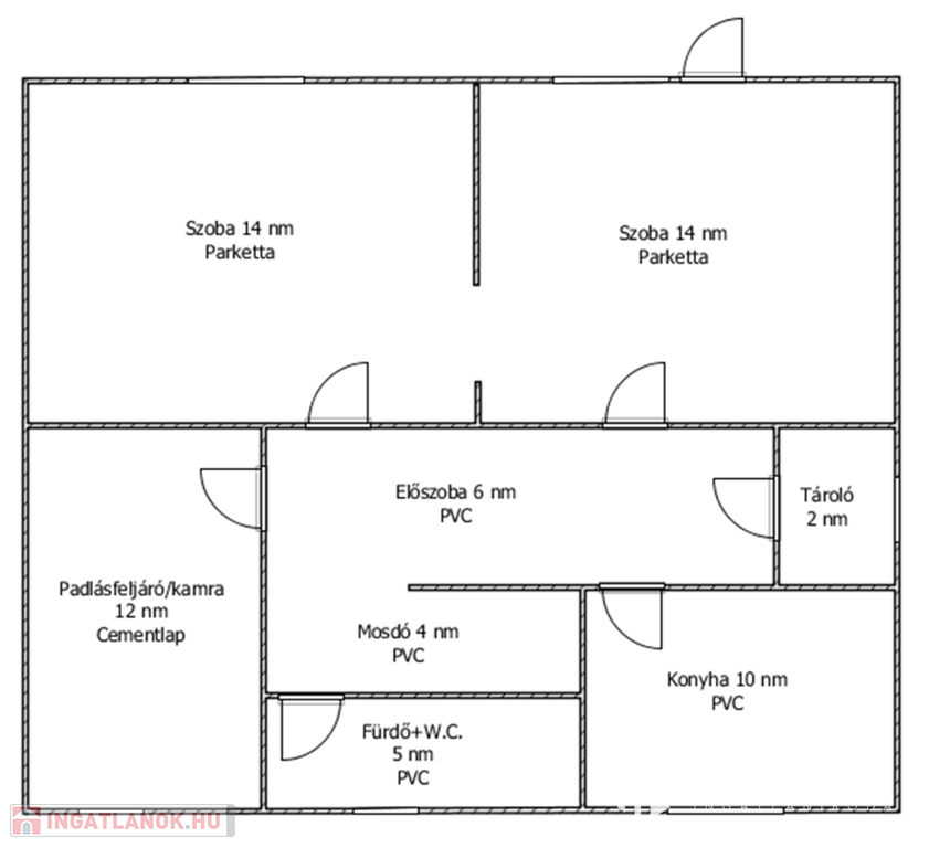 Helyiségei: 2 szoba, előszoba, fürdőszoba, konyha, kamra/padlásfeljáró, mosdó, tároló, az alsó szinten 20 nm-es pince.