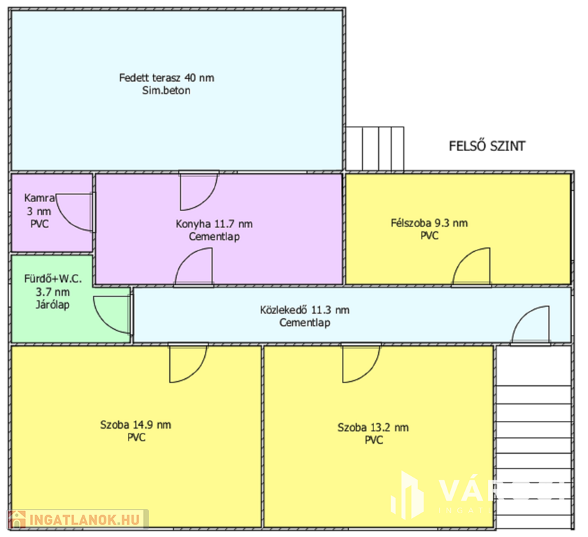 A felső szint helyiségei: 2 szoba, 1 félszoba, előszoba, fürdőszoba, konyha, kamra, fedett terasz.