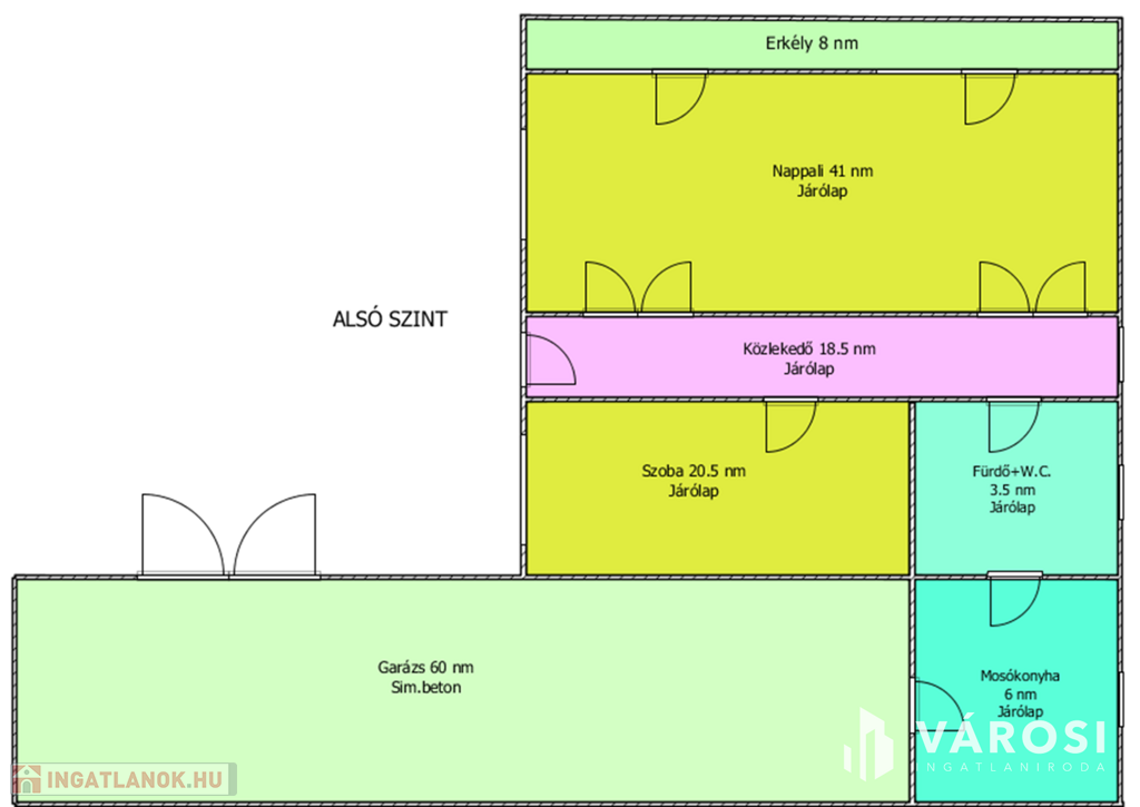 A földszinten a amerikai konyhás nappali, 1 hálószoba, erkély, fürdőszoba, háztartási helyiség, közlekedő, 60 nm-es garázs került kialakításra.