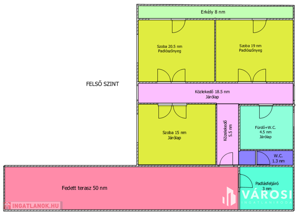 Az emeleti szinten 3 kényelmes hálószoba, fürdőszoba, külön nyíló W.C., közlekedő, 50 nm-es fedett terasz kapott helyet.