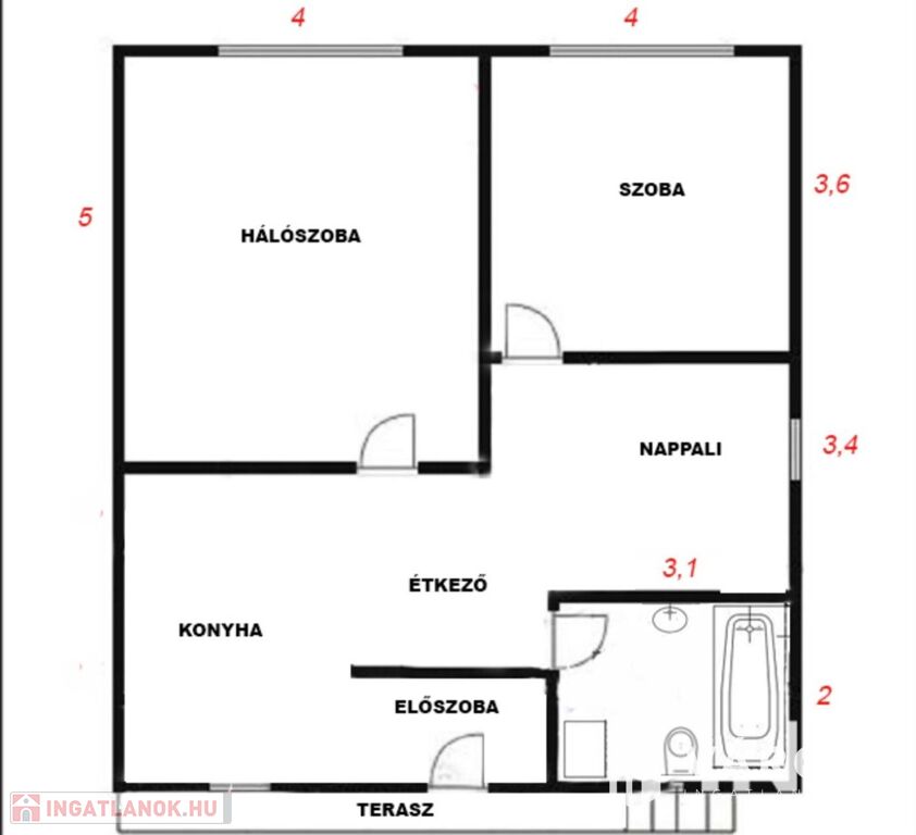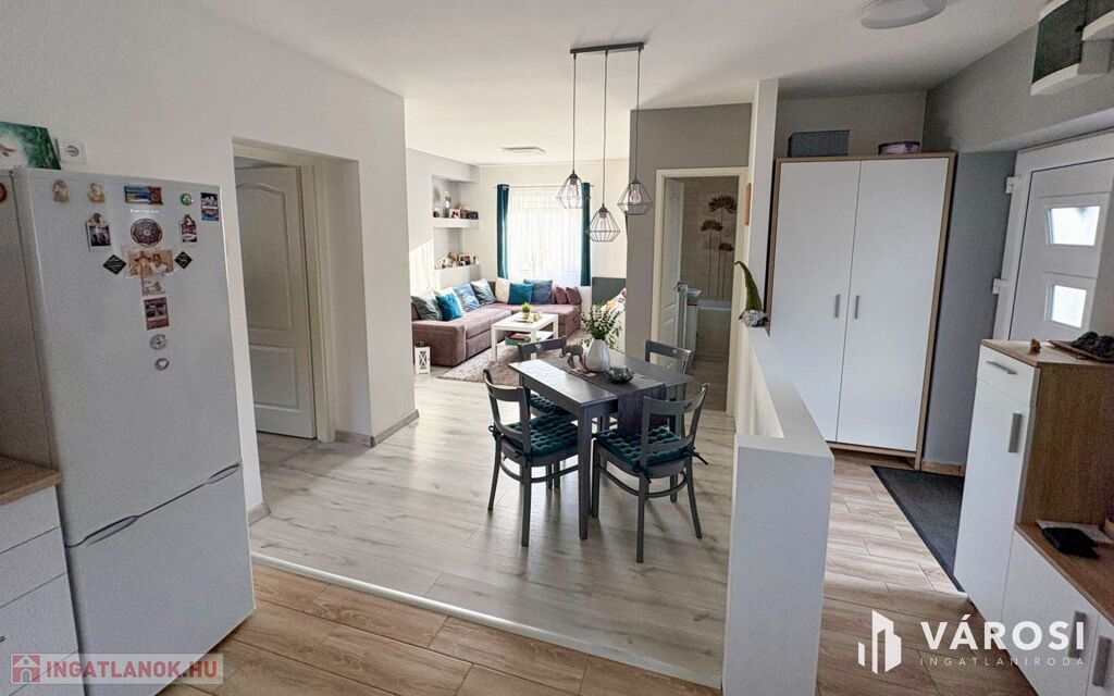 Helyiségei: Előszoba, konyha, étkező, nappali, fürdőszoba, 2 külön nyíló szoba.