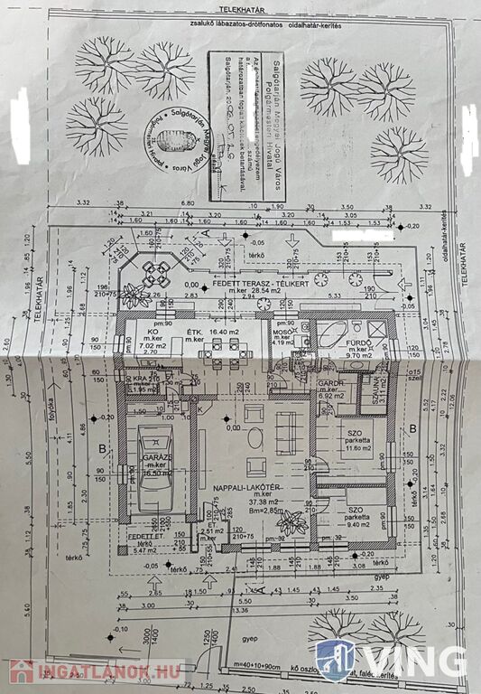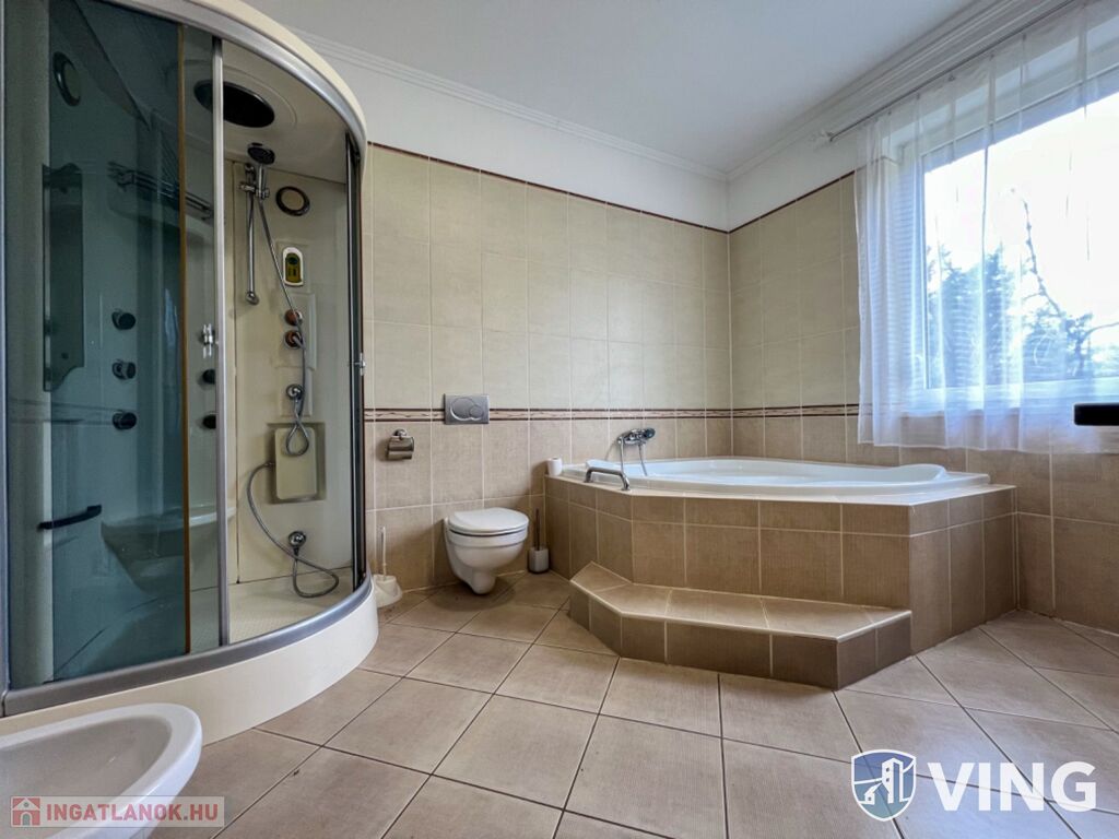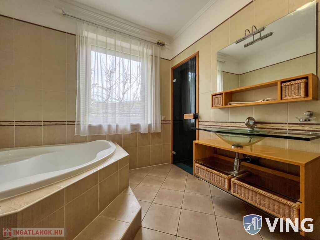 Helyiségei: 2 hálószoba, nappali, konyha+étkező, kamra, közlekedő, gardrób, mosóhelyiség, fürdőszoba, szauna, külön nyíló W.C., szélfogó, garázs, beépített terasz, nyitott terasz.