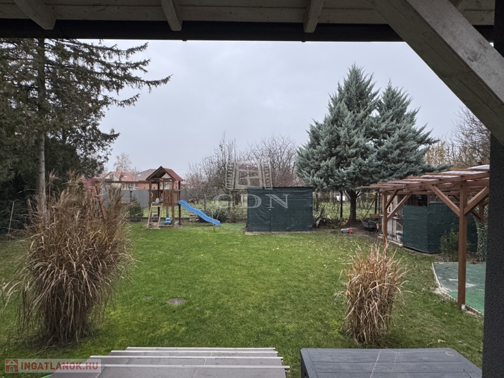 A telek 584m2, egy része térkövezett, hátsó része füvesített. A házhoz kapcsolódik egy fedett beálló és egy garázs is.
