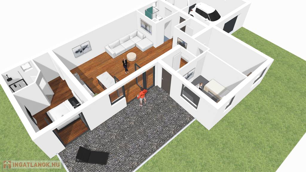 - 1 db garázs, előtte térkövezett kocsibeálló