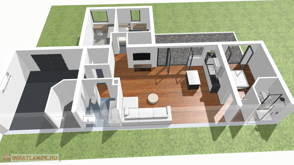 - hőszigetelt, 3 rétegű, műanyag nyílászárók, redőnyökkel (kívül antracit, belül fehér színben)