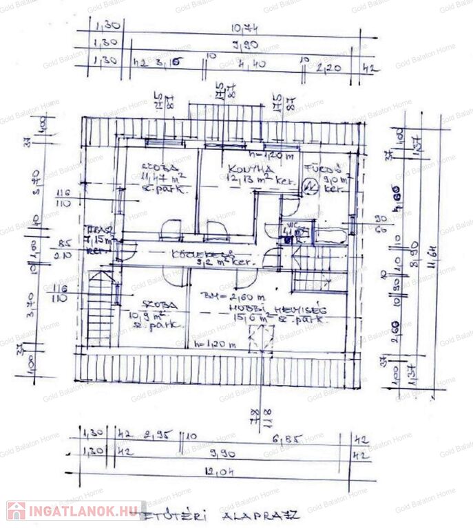 - tetőtér (70 nm + erkély 7,15 nm): közlekedő, hobbi helyiség, 2 szoba, konyha-étkező, fürdőszoba káddal, külön WC, erkély, lépcsőtér