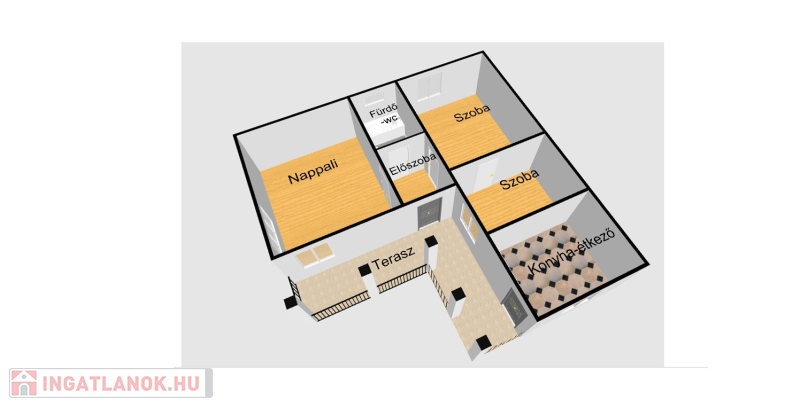 Az utcáról az udvaron át megközelíthető házba, a fedett teraszról léphetünk, az előtérbe, melyből a nappali egy szoba és a fürdőszoba érhető el. A szobába belépve pedig a harmadik szobát érjük el.