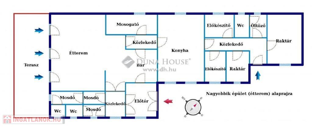 A nagyobbik felépítmény kb. 140m2-es, a házban korábban étterem üzemelt. Belső terei jelenleg ennek megfelelően vannak kialakítva, így akár újra megnyitható étteremként, de családi házzá, vagy akár két különnyíló lakássá is átalakítható. Az ingatlan belső állapotát tekintve felújításra szorul, azonban állékony, statikailag is remek állapotnak örvend. Külső homlokzata rendezett, teteje szép állapotú, modern, gázbeton cseréptető.