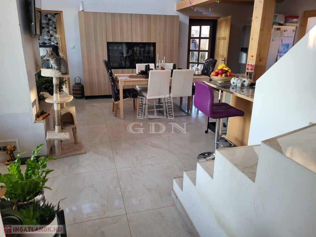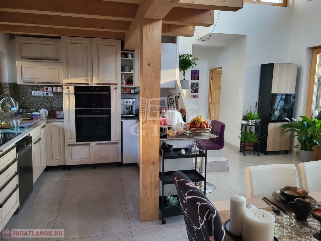 A ház központi része a tágas nappali+amerikai konyha+étkező helyiség, amely összesen 35 m2 és hozzá tartozik még egy 12 m2-es galéria. A nappaliban egy hangulatos kandalló került kialakításra, melynek hátoldalán kerti kemence is kiépíthető. A nappaliban jellemzően a világos színek dominálnak és sok ablak került kialakításra benne, így egy luxus hatású, világos helyiség amely eléri a 4,5 méteres belmagasságot is.