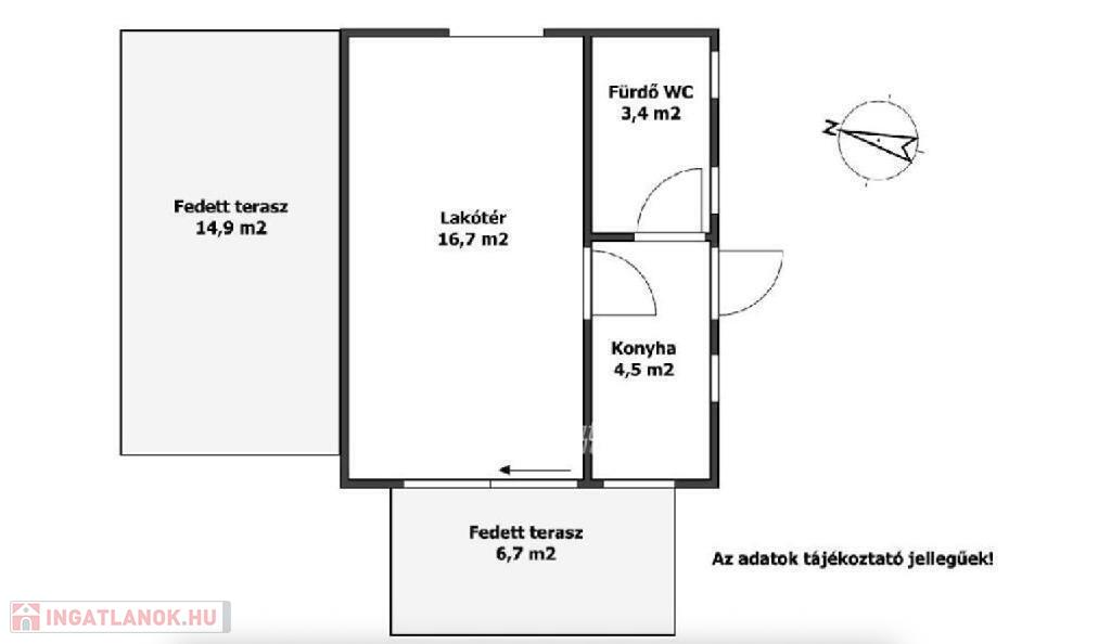 A különálló, egyszintes épület 25 nm-s lakóteret kínál, két fedett terasszal.