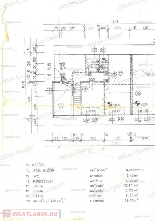 2) emelet: lépcsőfeljáró, hálórész, konyha, fürdőszoba vécével