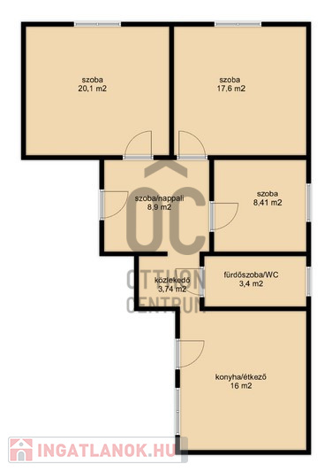 - 3 szoba, nappali, konyha, fürdőszoba-WC helyiségekből áll.
