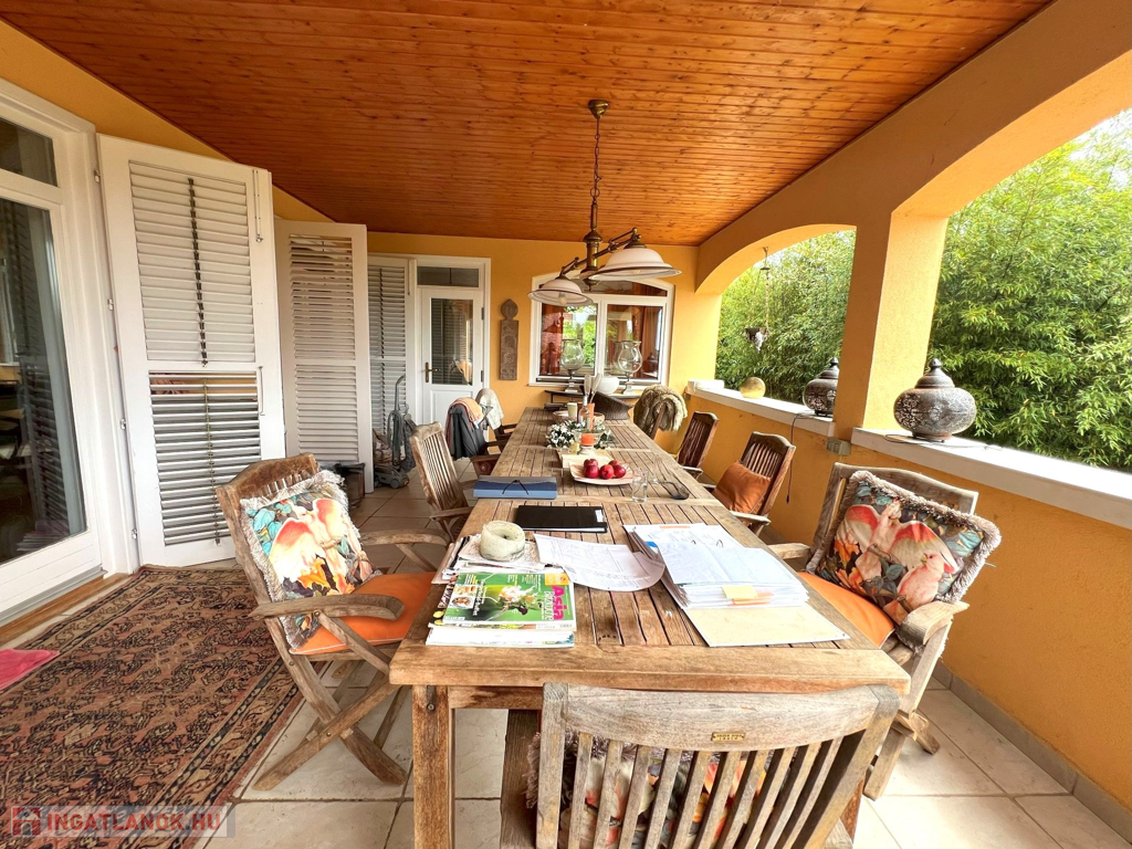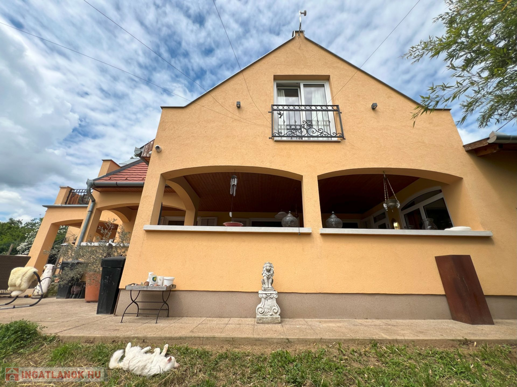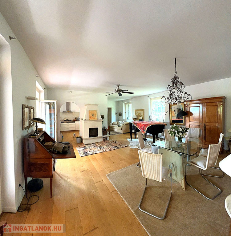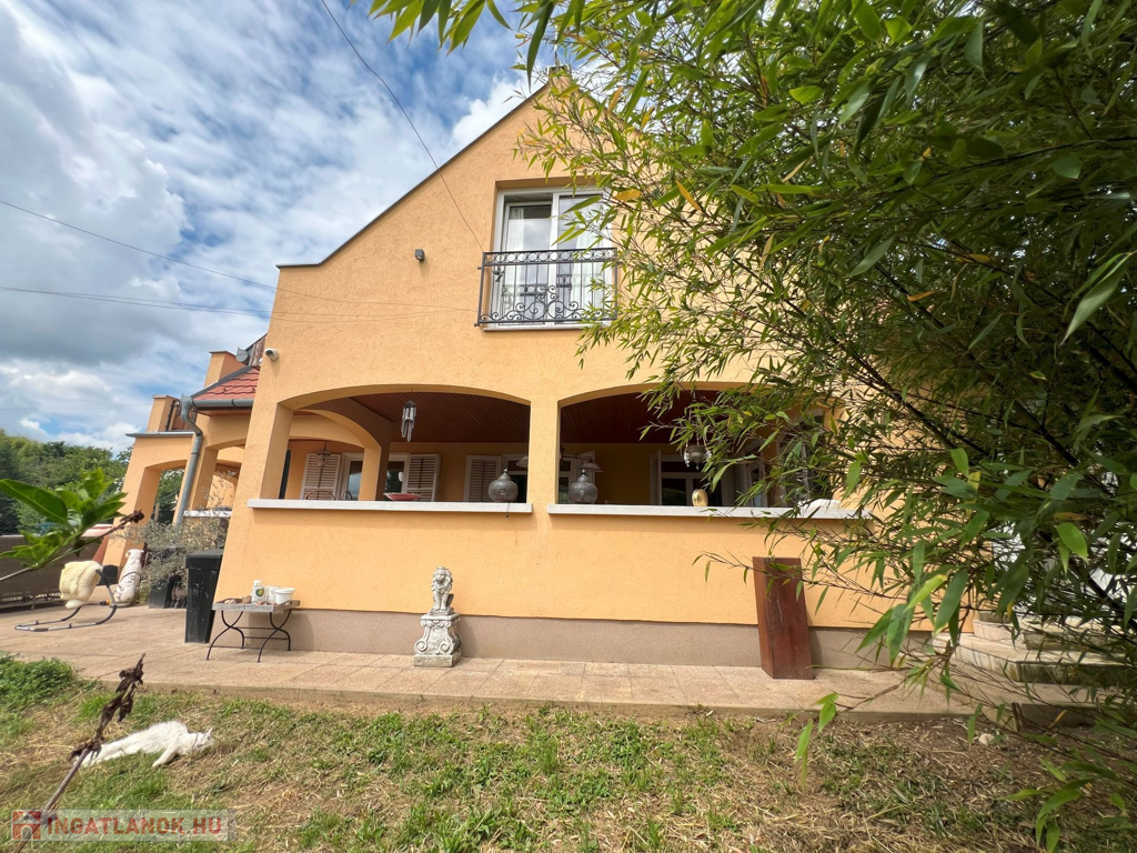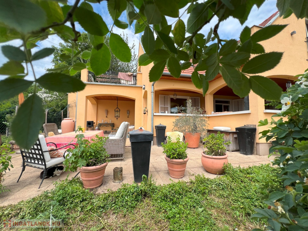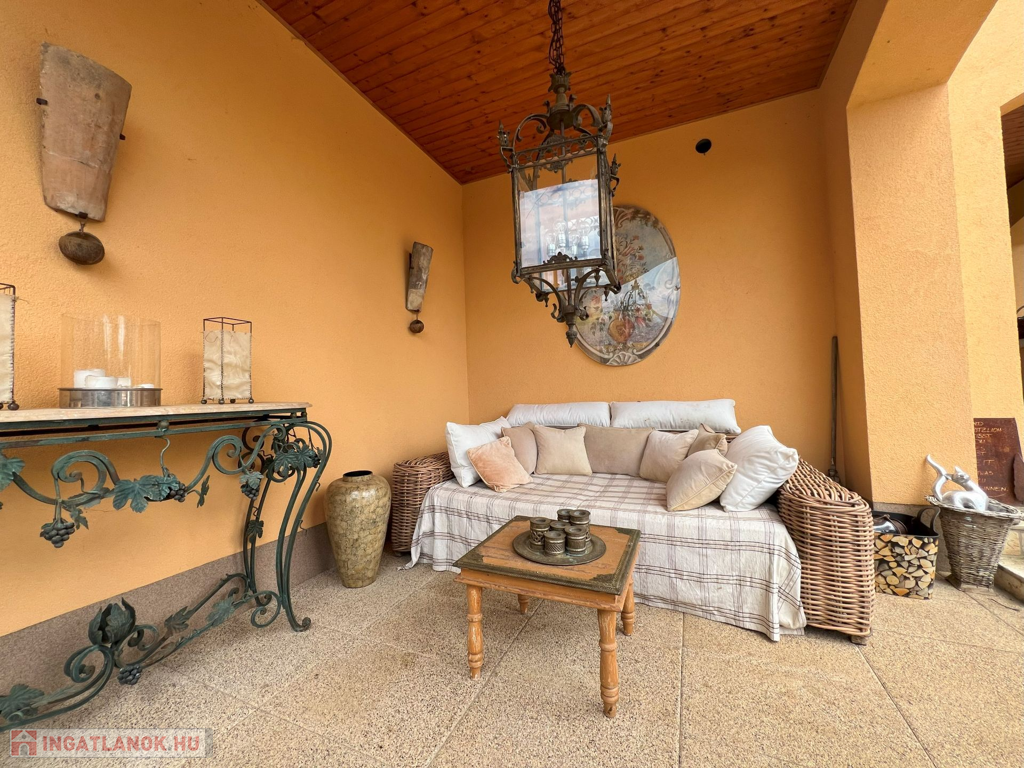 Az ingatlan jellemzői: Az impozáns, 250 négyzetméteres főépületéhez három hangulatos terasz tartozik: két fedett az alsó szinten, valamint az emeleten egy különleges panorámaterasz, lélegzetelállító kilátással a környező dombvidékre. A mediterrán stílusjegyeket viselő, boltíves, mintegy 45 m²-es alsó terasz teljesen fedett, és akár télikertté is átalakítható. Két bejáraton keresztül közvetlenül kapcsolódik az egy légterű konyhához, étkezőhöz és nappalihoz, így ideális közösségi tér jön létre. A konyha mellett kamra található, amelyet egy praktikus háztartási helyiség követ. A földszinten három szoba található, ezek közül az egyikben beépített szekrények segítik a praktikus tárolást, valamint egy padlófűtéssel ellátott fürdőszoba is biztosítja a kényelmet. A földszintről egy tömör tölgyfa lépcső vezet fel az emeletre. A tetőtér 2018-ban teljes körű felújításon esett át, modern loft stílusban: itt kapott helyet egy külön gardróbszoba beépített szekrényekkel, egy újabb padlófűtéses fürdőszoba, valamint egy nyitott galériatér. Mindkét szintet egész nap elárasztja a természetes fény.