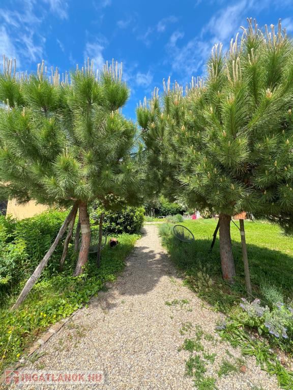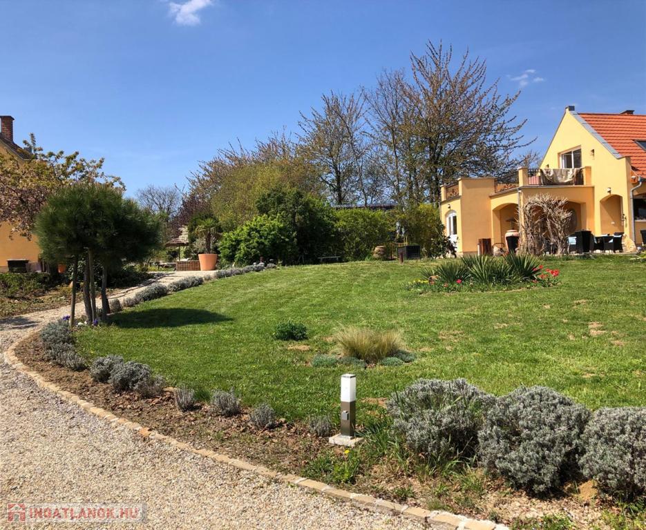 Telek: A több mint 7700 négyzetméteres, 2 méter magas vadkerítéssel körbekerített, gondozott, parkosított telek minden részletében a természet és az otthonosság harmóniáját tükrözi. Itt idős dió-, mogyoró-, fenyő-, lucfenyő- és gyümölcsfák, valamint két nagy fügefa is megtalálható. A birtokra egy elegáns kovácsoltvas kapun keresztül juthatunk be, majd egy levendulával szegélyezett út vezet egészen a házig, már az első pillanattól megidézve a mediterrán vidékek nyugodt életérzését. A kert központi látványeleme a természetes, vegyszermentes biotó, amelyet elektromos árammal működő patak/vízesés, különféle szűrők és a tó növényei tisztítanak. A tó mellett egy finn szauna is helyet kapott, így a pihenés és feltöltődés garantált.
