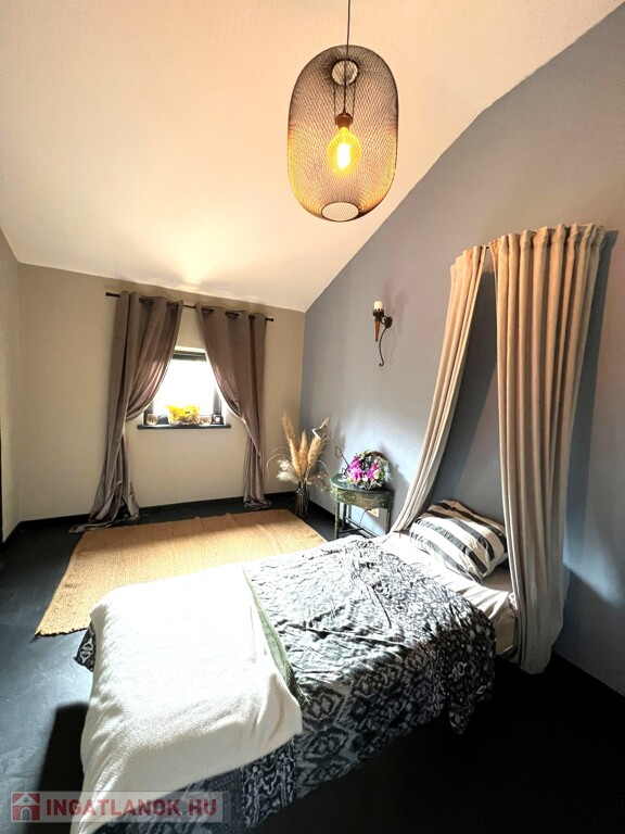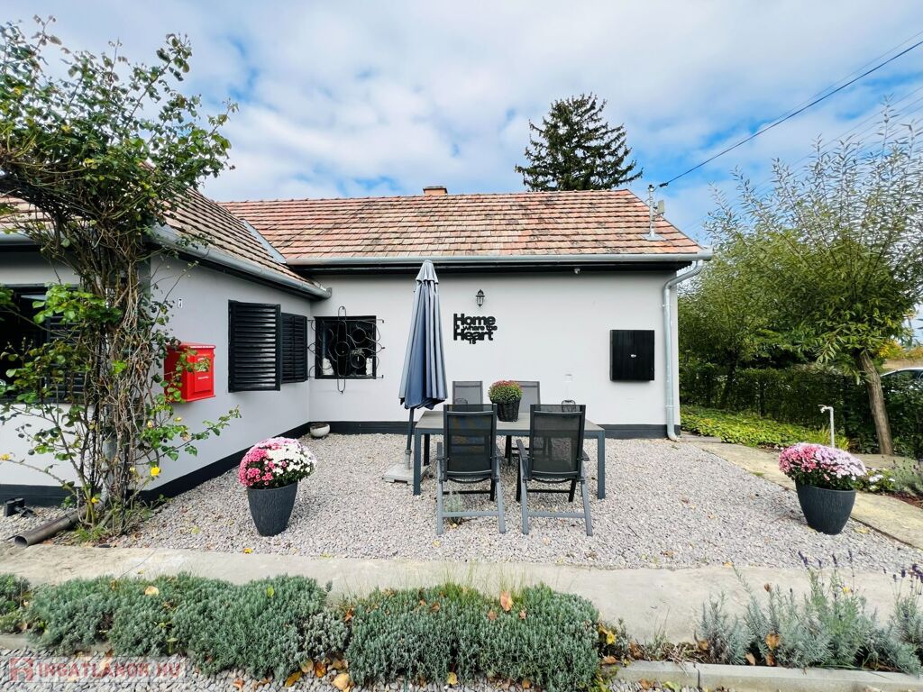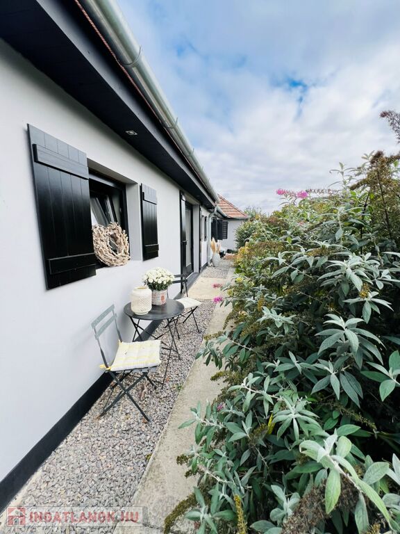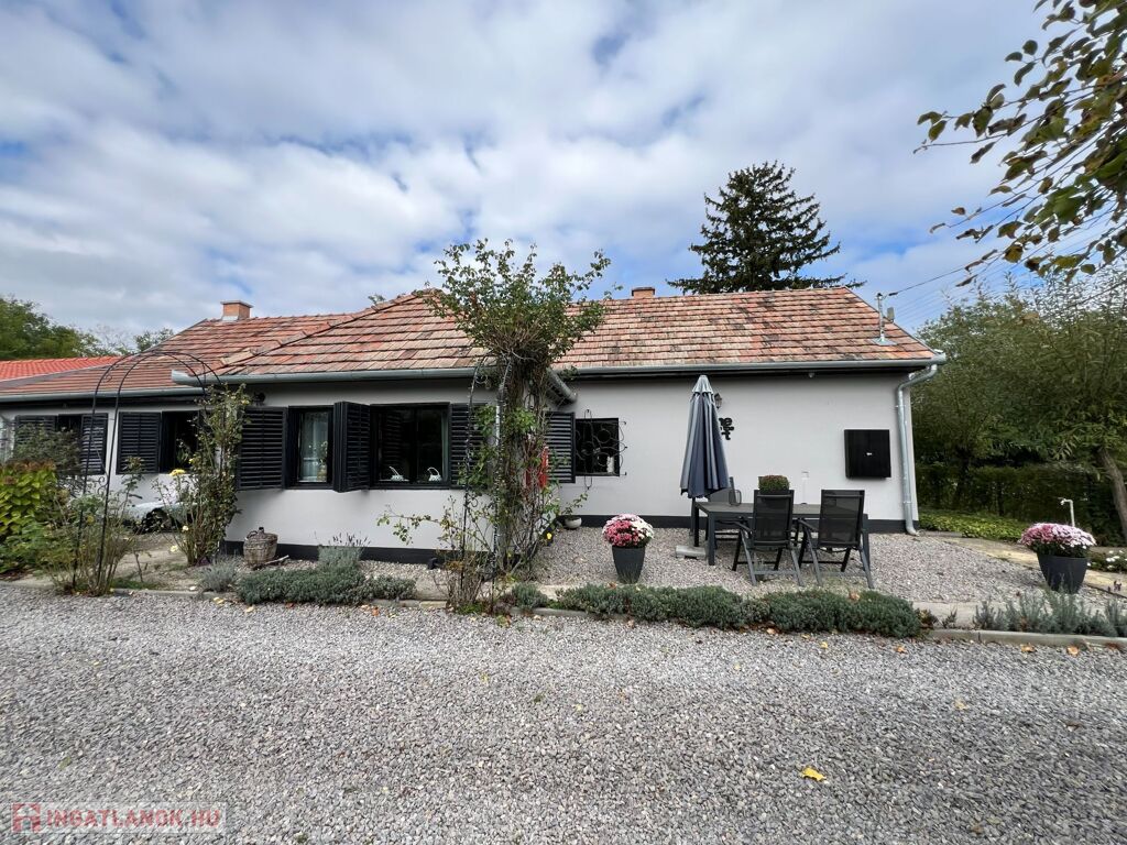 Az ingatlan jellemzői: A főbejáraton át egy világos közlekedőbe érkezünk, ahonnan minden helyiség könnyen megközelíthető. Innen jutunk el a fényes, jelenleg olvasótérként használt előszobába, amelyből nyílik a modern, gépesített konyha étkezővel, valamint az egyik barátságos hálószoba. A közlekedő másik irányába található a zuhanyzós fürdőszoba WC-vel, egy külön helyiség, amelyet most mosókonyhaként használnak, továbbá a nagy belmagasságú, rendkívül világos nappali, amely a ház központi tere. Innen közelíthető meg a másik, tágas és kényelmes hálószoba is. A fa nyílászárók tovább erősítik a ház természetes, otthonos hangulatát.
