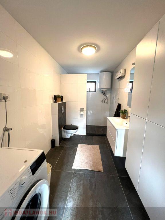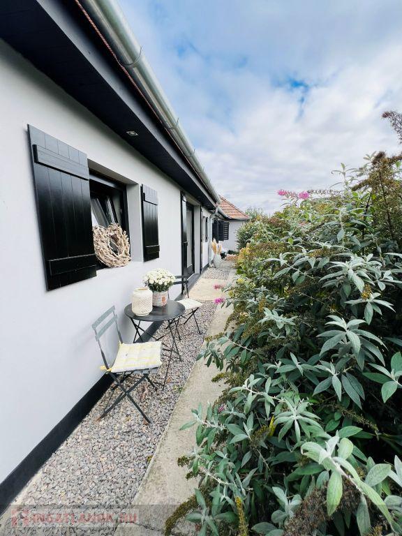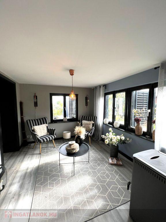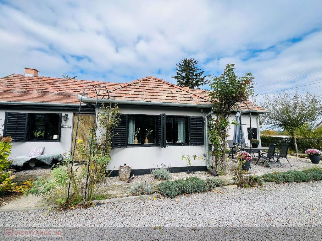 Az ingatlan jellemzői: A főbejáraton át egy világos közlekedőbe érkezünk, ahonnan minden helyiség könnyen megközelíthető. Innen jutunk el a fényes, jelenleg olvasótérként használt előszobába, amelyből nyílik a modern, gépesített konyha étkezővel, valamint az egyik barátságos hálószoba. A közlekedő másik irányába található a zuhanyzós fürdőszoba WC-vel, egy külön helyiség, amelyet most mosókonyhaként használnak, továbbá a nagy belmagasságú, rendkívül világos nappali, amely a ház központi tere. Innen közelíthető meg a másik, tágas és kényelmes hálószoba is. A fa nyílászárók tovább erősítik a ház természetes, otthonos hangulatát.