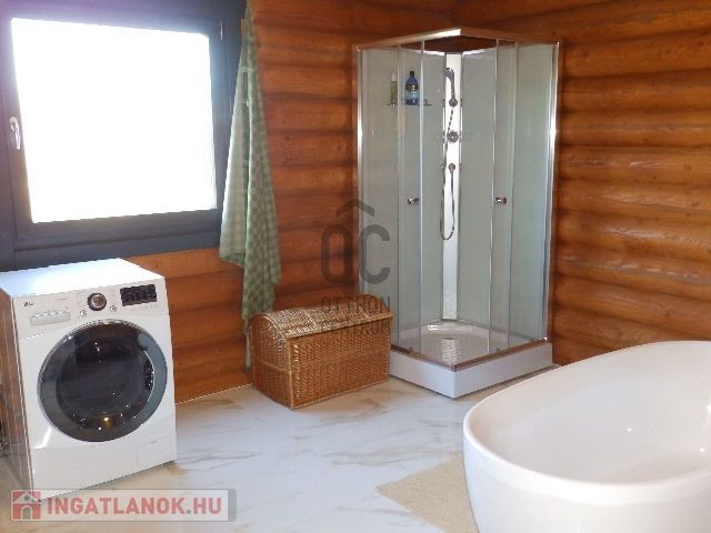 A faépítésű ház meleg hangulata, modern burkolatokkal és szaniterekkel egészül ki.