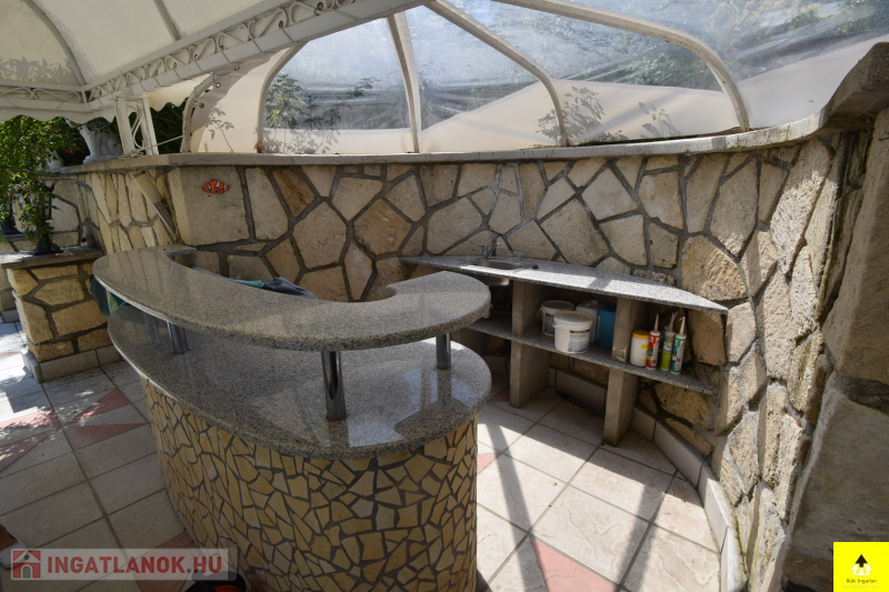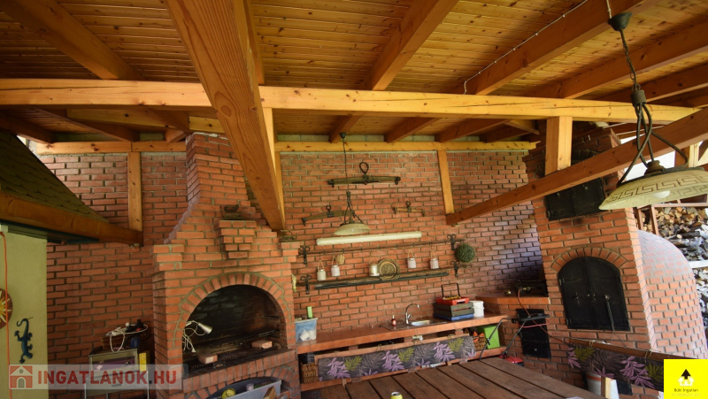 különálló, kis épület nyári konyhával, téglából épített grillsütővel és fedett kiülővel