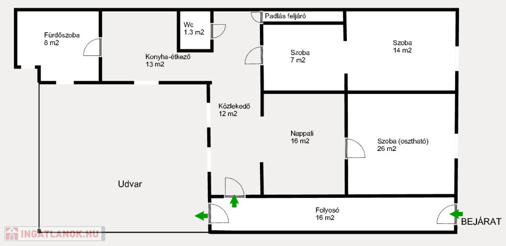 Az elrendezés megtekinthető az alaprajzon, egyszerű könnyen kivitelezhető átalakítási lehetőség adott, ha több külön nyíló szobára lenne szükség.