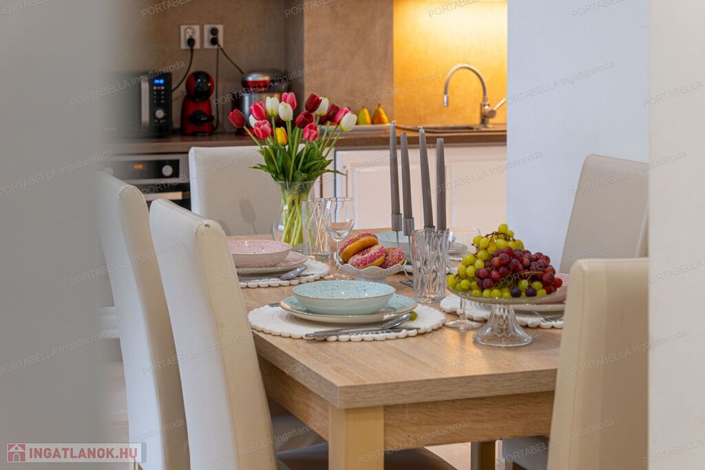 A tágas, 5 szobás ingatlan központi eleme az amerikai konyhás nappali, amely modern és esztétikus belső kialakítást kínál, alkalmas nappali-étkező- és közösségi térként egyaránt.