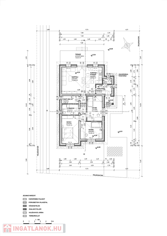 A tartószerkezeti falak Porotherm P30N+F téglából, betonkoszorúval, fa födémes tetőszerkezettel készülnek. A lábazat 10 cm polisztirol lépésálló, a homlokzatok 15cm-es EPS, a vízszintes födém 25 cm ásványgyapot szigeteléssel lesz ellátva.